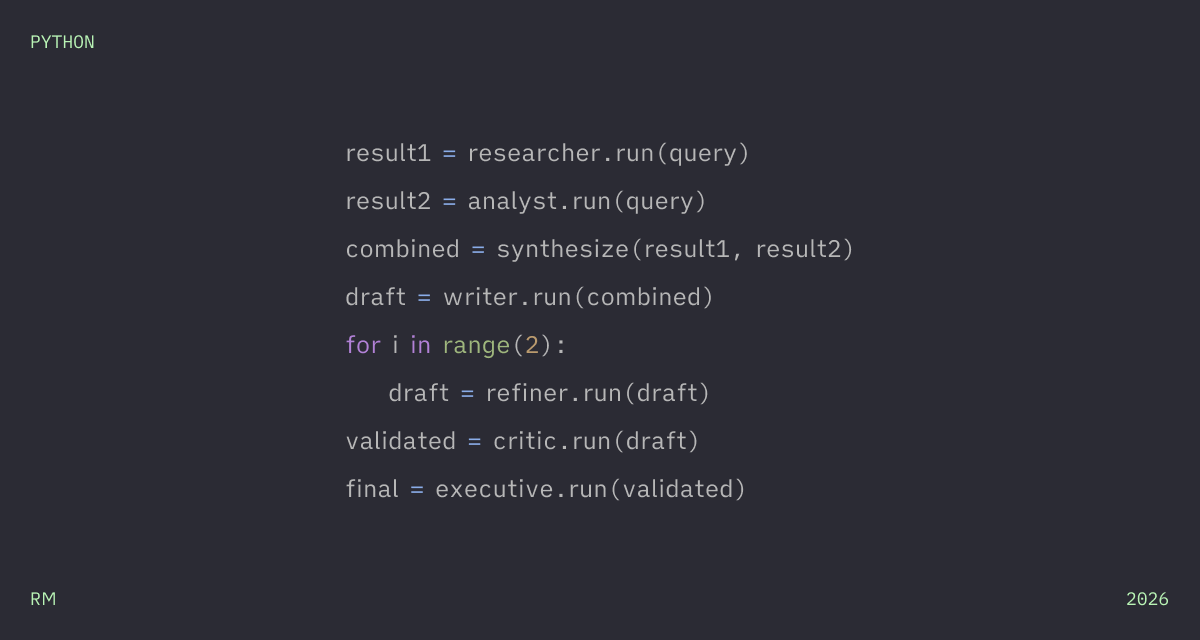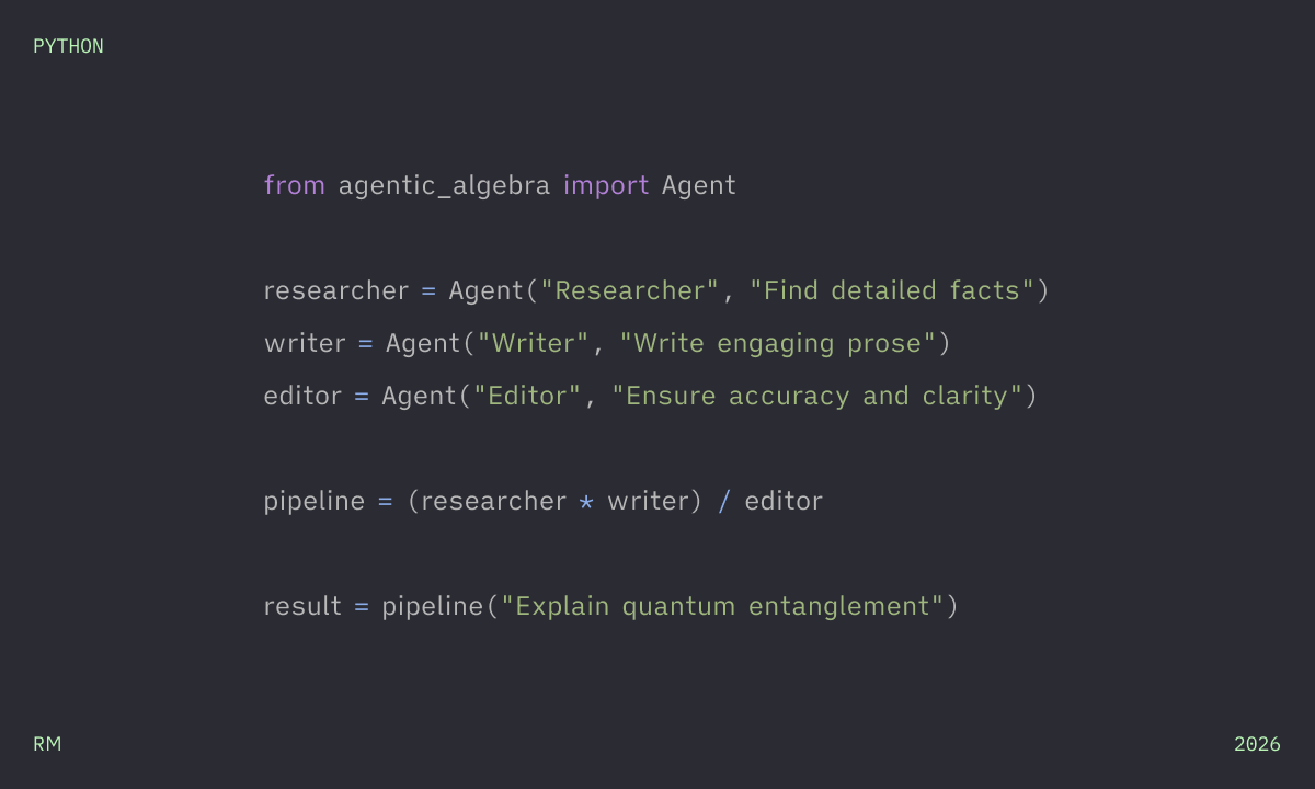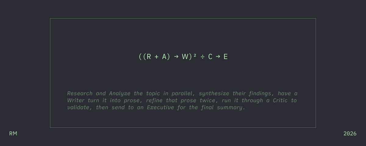(researcher * writer) / editorBuilds a graph. No API calls. Lazy.